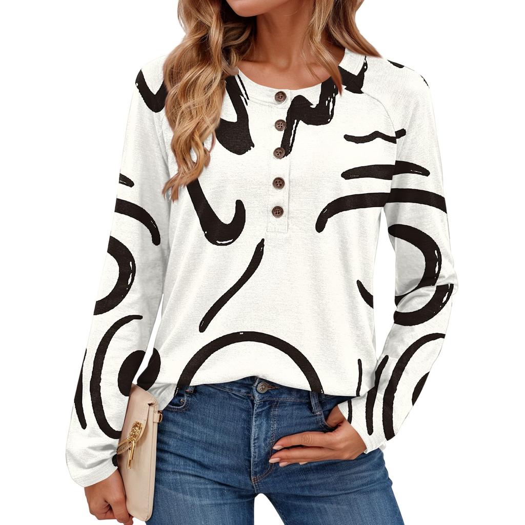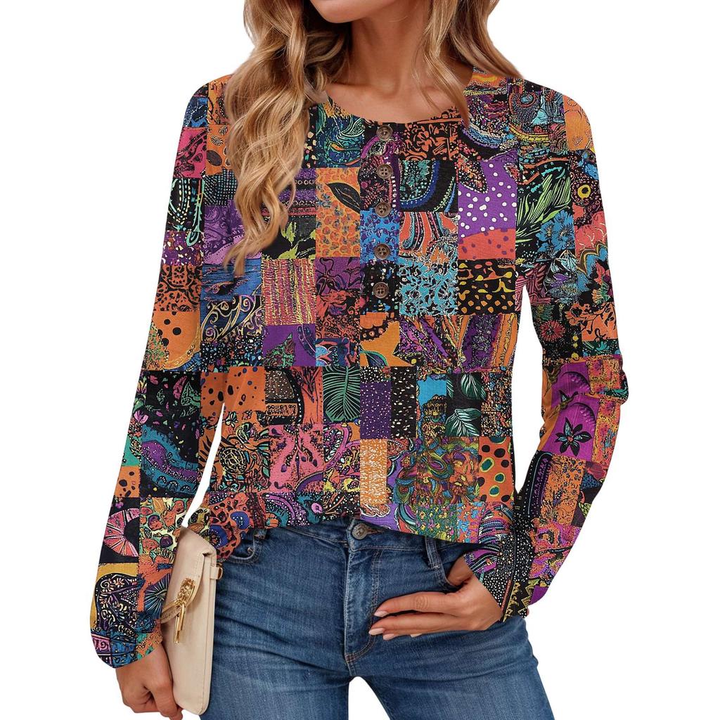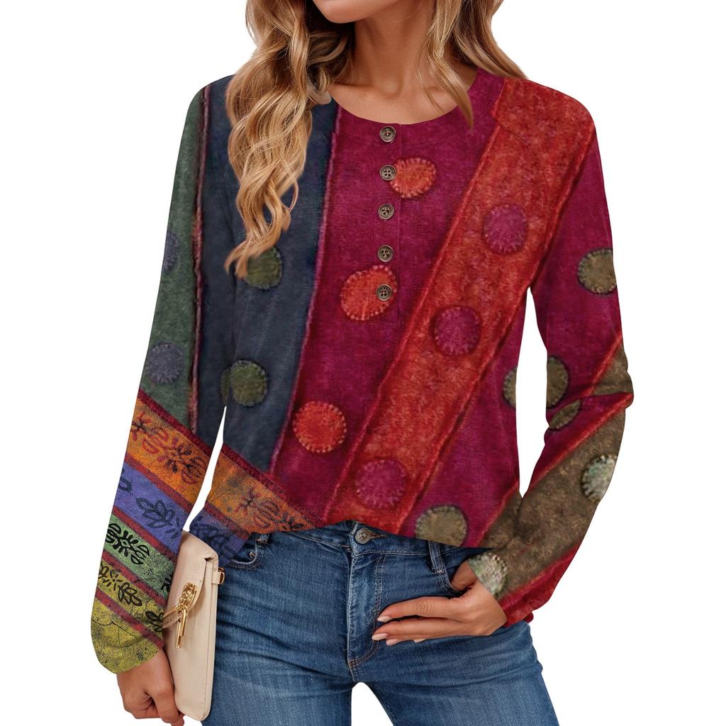 Женский модный ретро топ с геометрическим принтом, круглым вырезом и длинными рукавами
