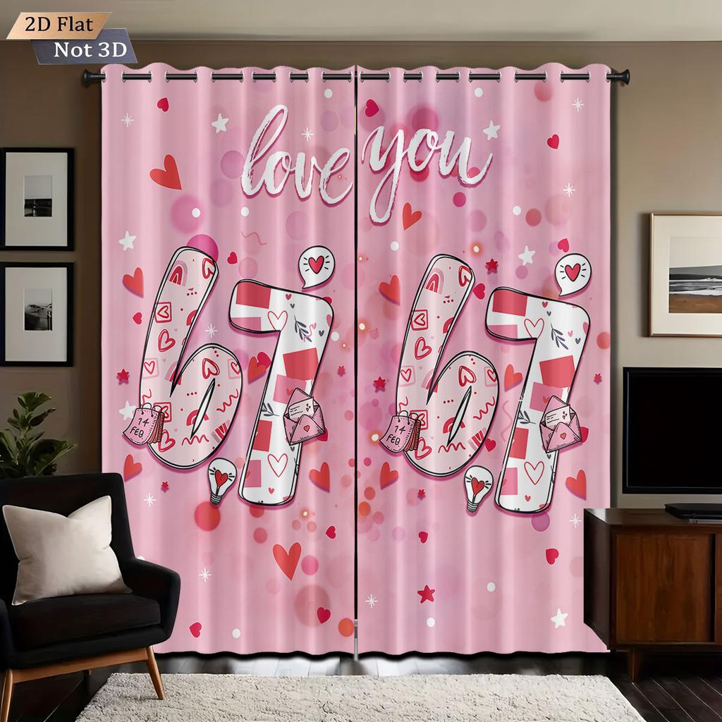 2pcs Valentine's Day Pink Love 67 Element Print Blackout Perforated Curtain Multi Size Living Room Bedroom Insulation Decoration