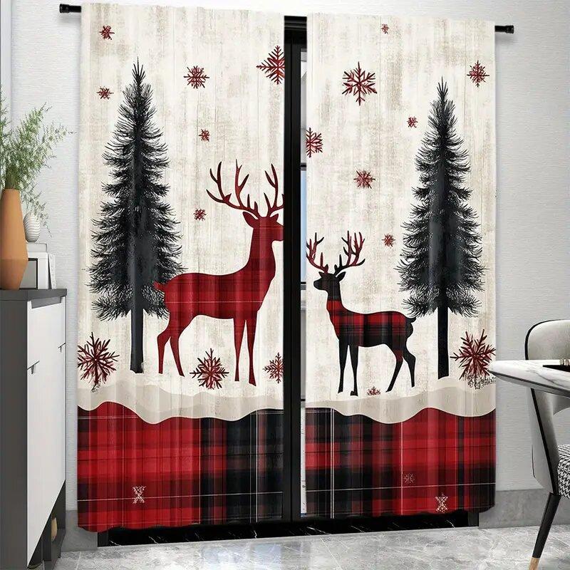 2 Pieces - Christmas curtain checkered Christmas reindeer, tree and snowflake print curtains, home decoration, room decoration