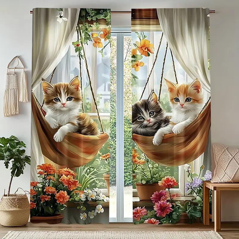 2 шт. - Очаровательные шторы с принтом кошек и цветов, шторы с кулиской, для спальни и гостиной, украшение дома, украшение комнаты
