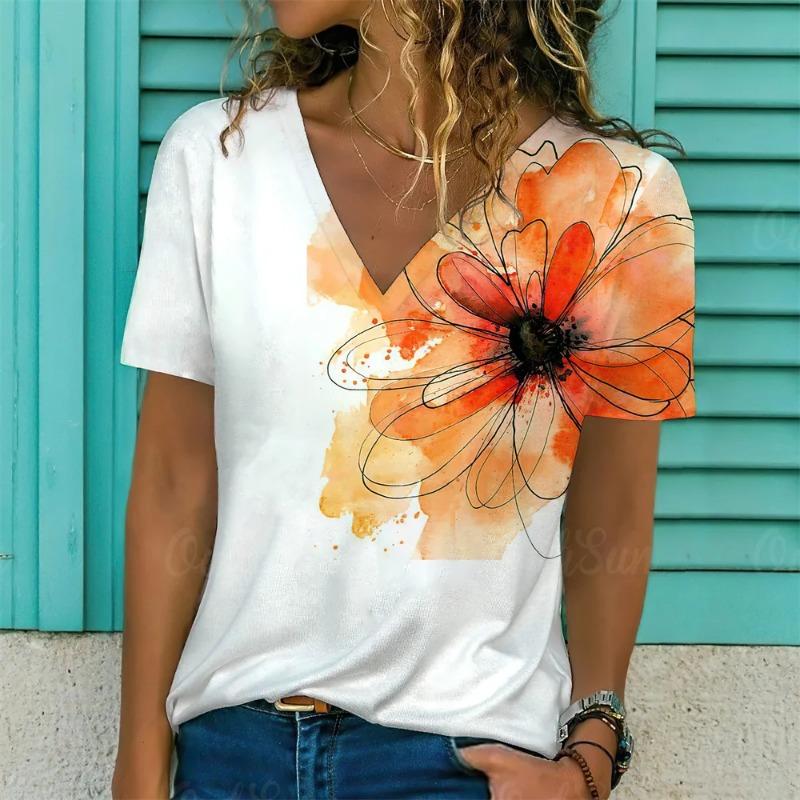 Summer Women Short Sleeve V-neck Oversized T-Shirt for Women White Fashion Ladies T-shirt 3d Dragonfly Print Top Casual Clothes