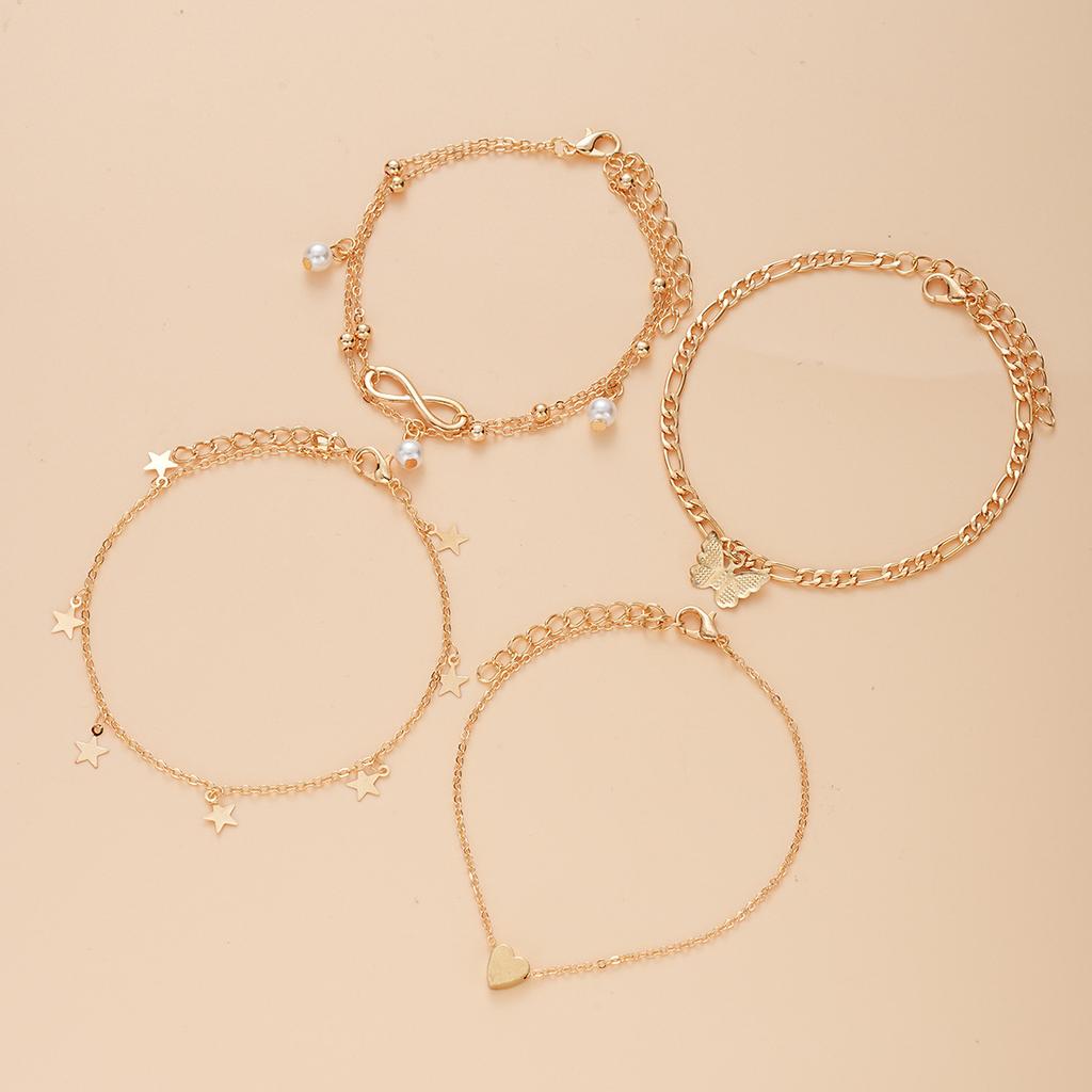 Temu hot-selling imitation pearl beach anklet five-pointed star butterfly pendant lucky 8-character multi-layer anklet set 4-piece set