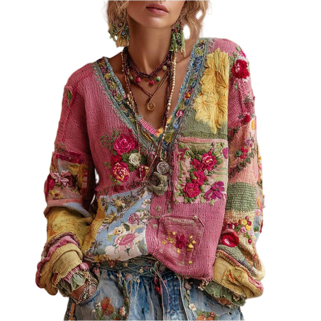 Женская мода Топ с длинным рукавом, V-образным вырезом, винтажный, пэчворк, с цветочным принтом, повседневный