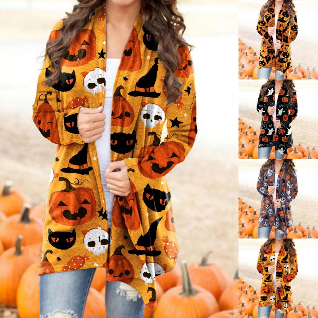 Женская повседневная модная куртка-кардиган без пуговиц с длинным рукавом и принтом на Хэллоуин