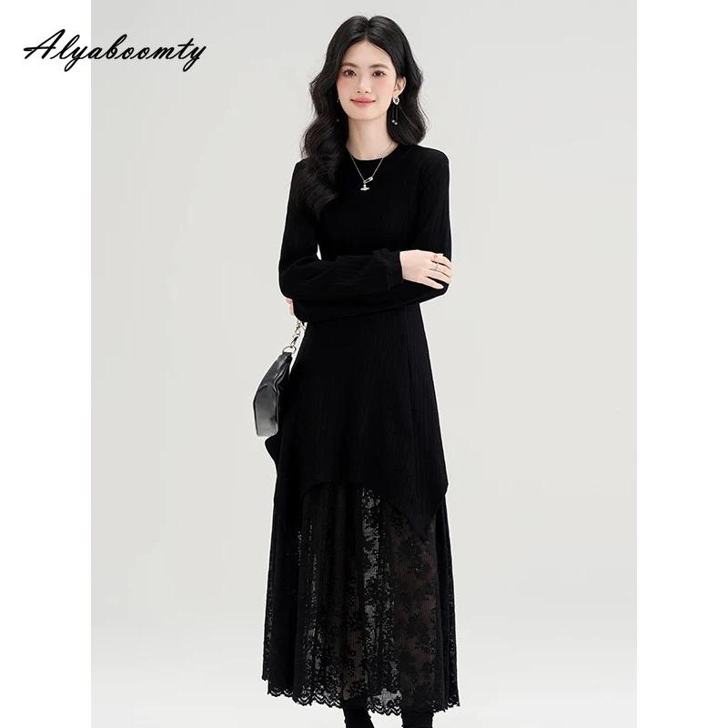 Французский стиль Осень Зима Женское Макси Длинное Платье Краткий О-образный вырез Вязание Кружево Пэчворк Платье Толстое Теплое Вязаное Рюши Женственное Платье