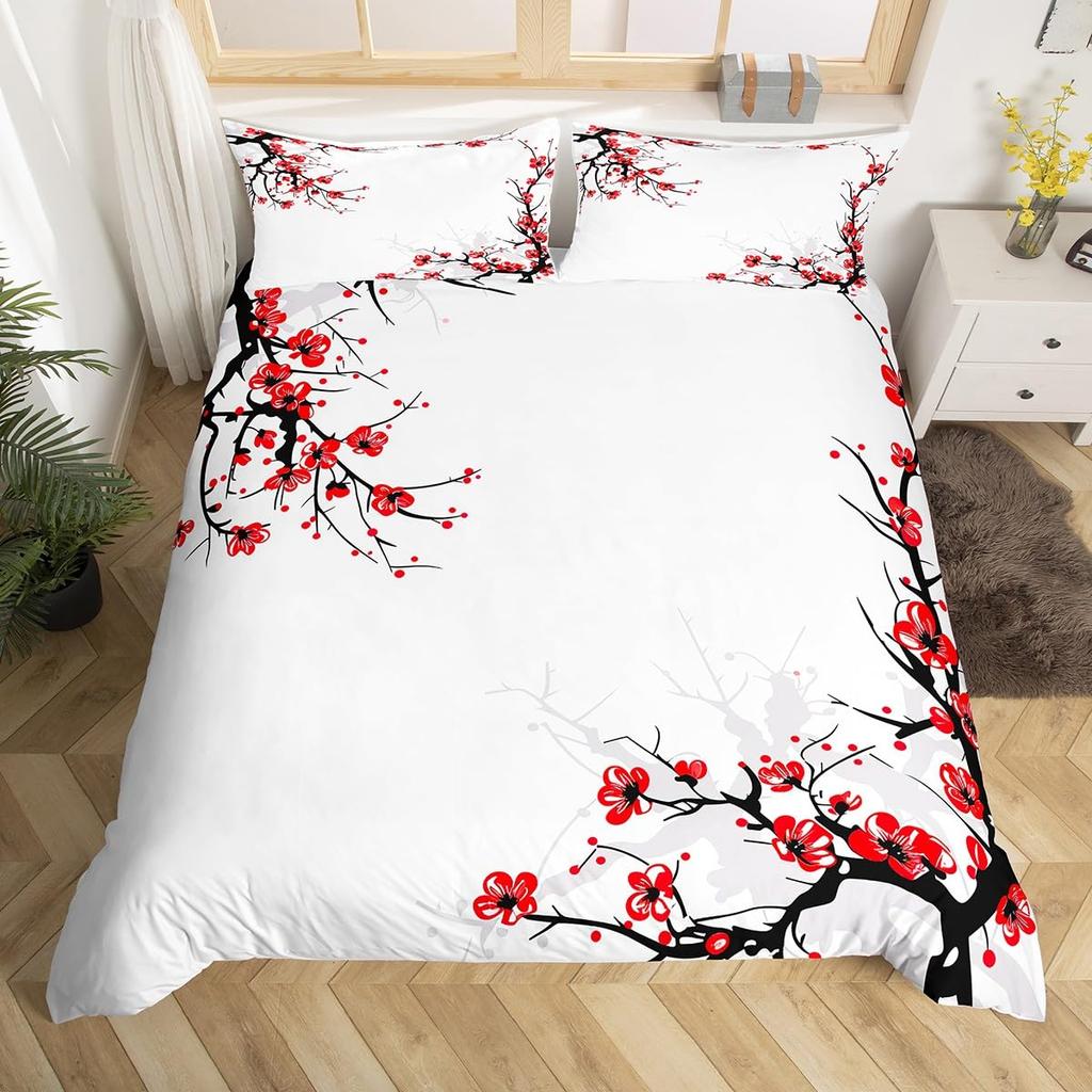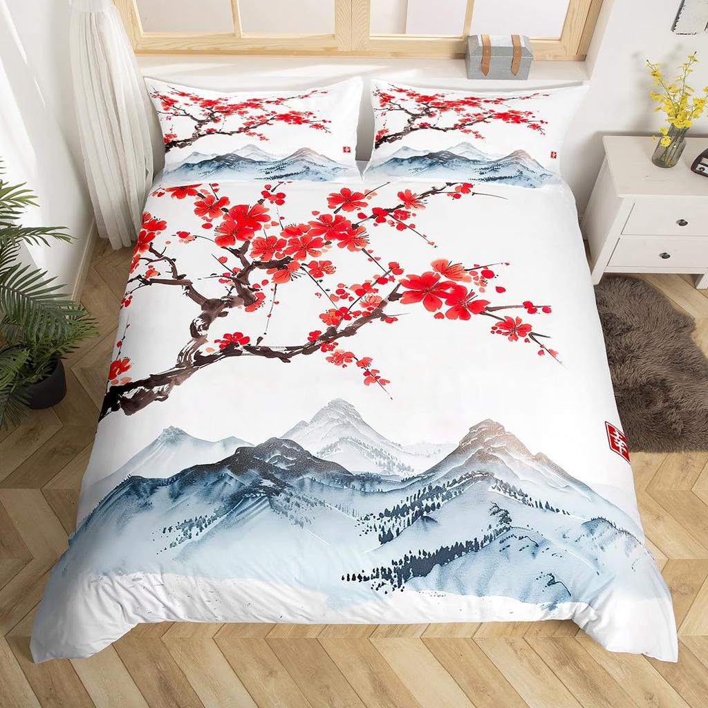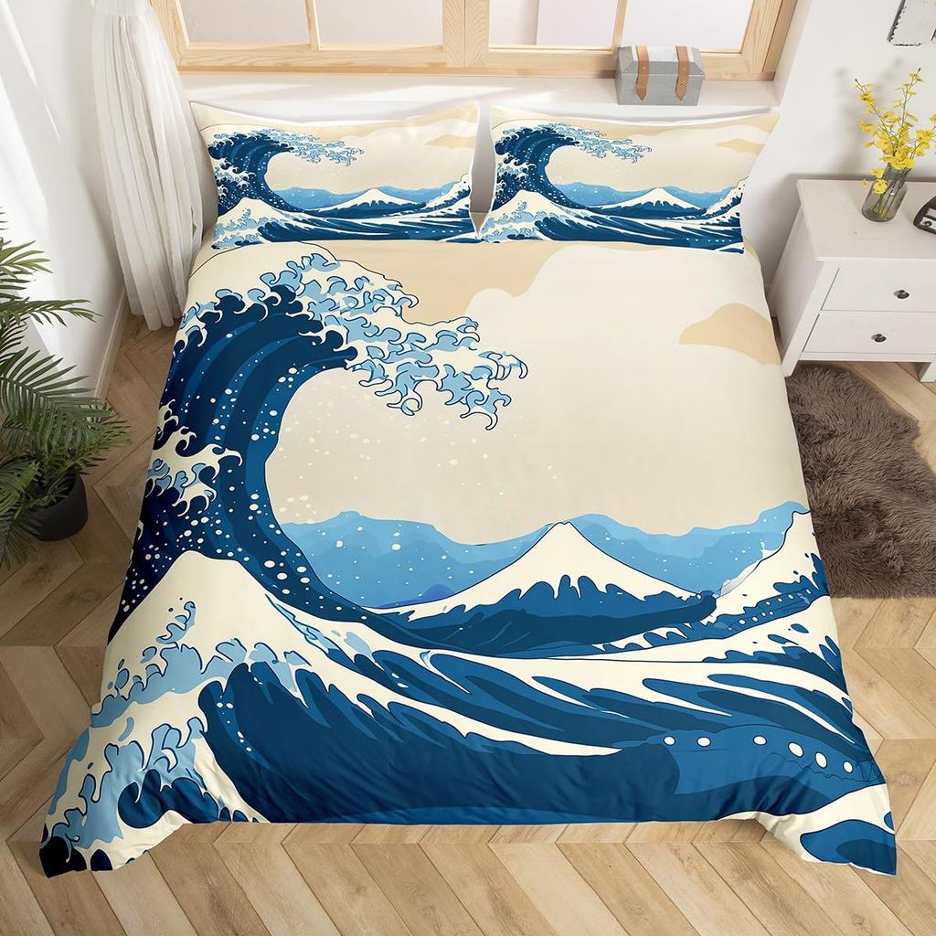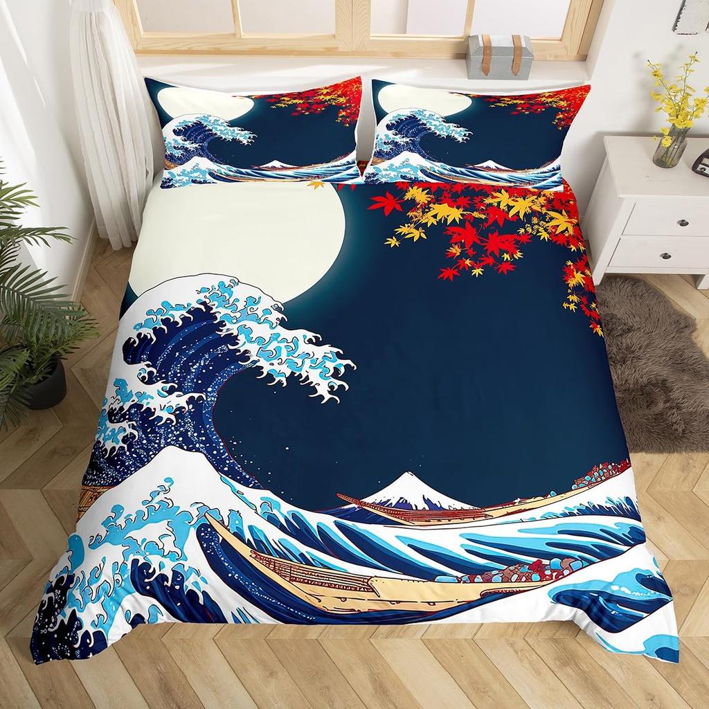 Комплект постельного белья в японском стиле, размер твин, комплект пододеяльника с японской волной, вишневые цветы, океанская волна, закат