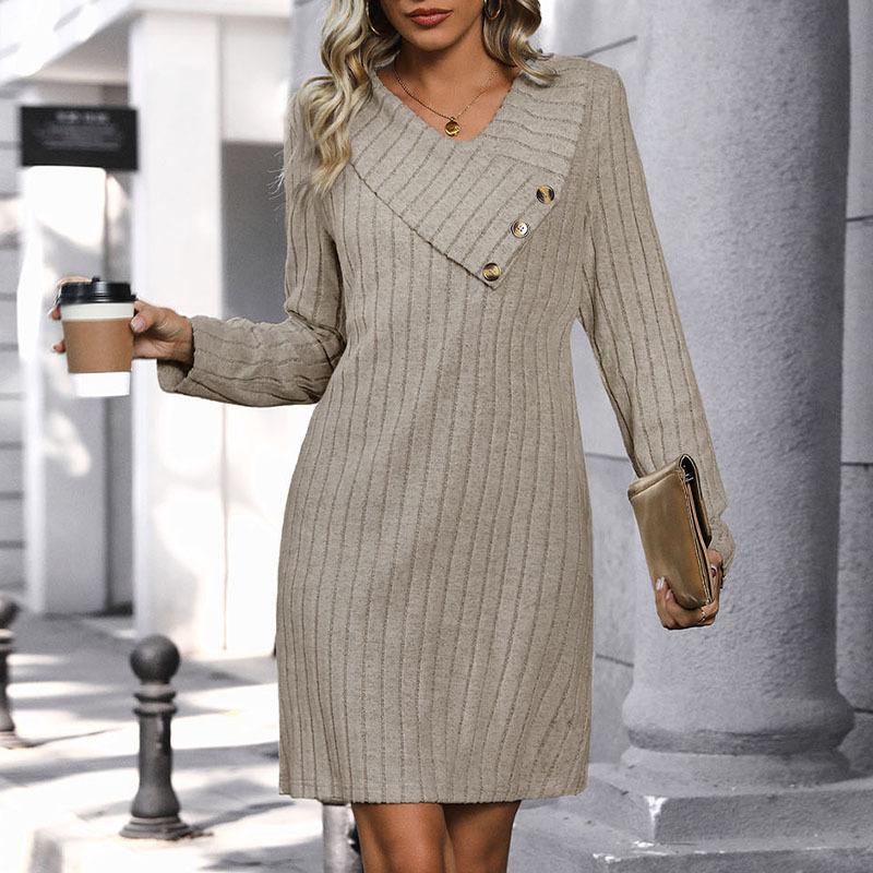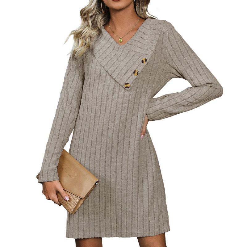 Осеннее трикотажное платье в полоску, однотонное трикотажное платье с V-образным вырезом, шикарное, удобное и универсальное, темпераментное, элегантное, повседневное, женская одежда