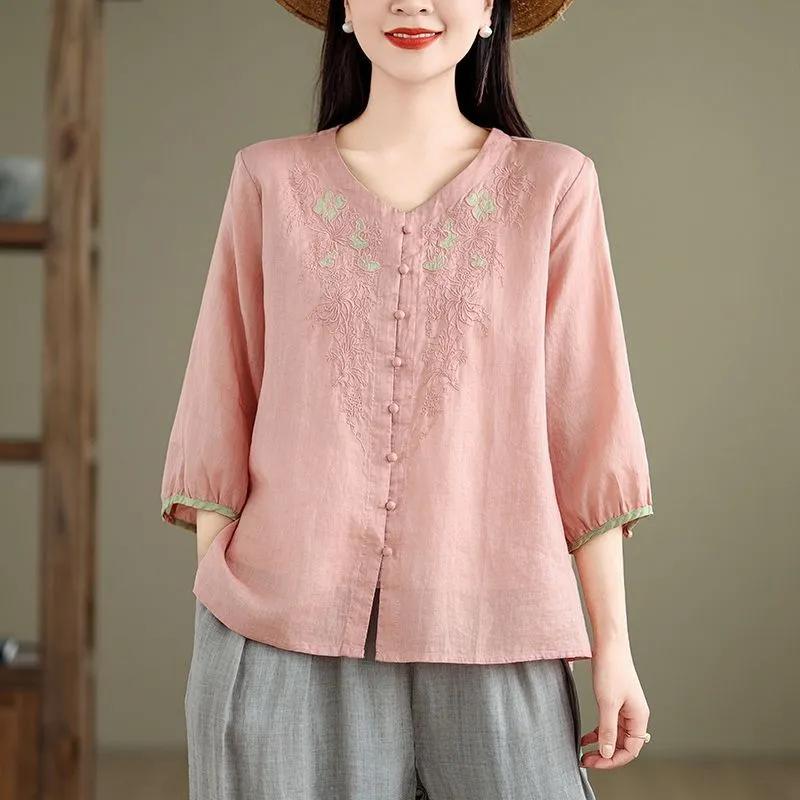 Летняя Новая Художественная Блузка с Рукавом Три Четверти Вышитая Свободная Повседневная Блузка Ретро Топ на Пуговицах