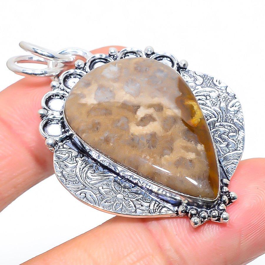 Natural Fossil Coral Gemstone Handmade 925 Sterling Silver Pendant 2.17" SP-3979