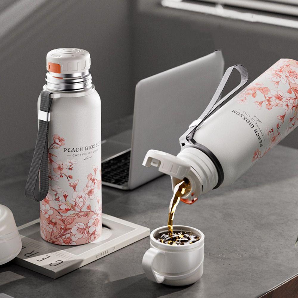 Stainless Steel Travel Mug with Filter Thermal Cup Sports Kettle Flower Pattern Thermos Bottle Car