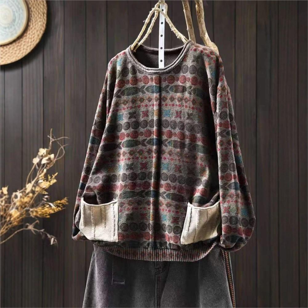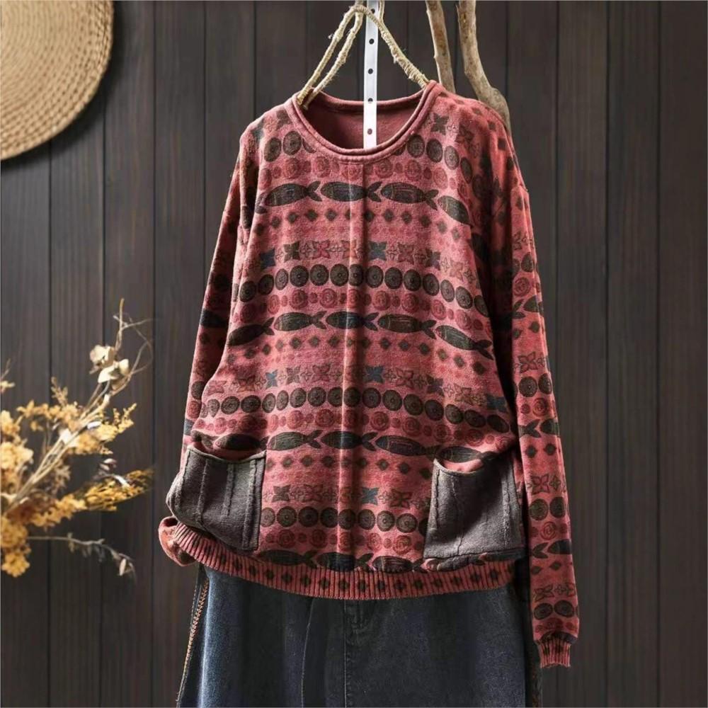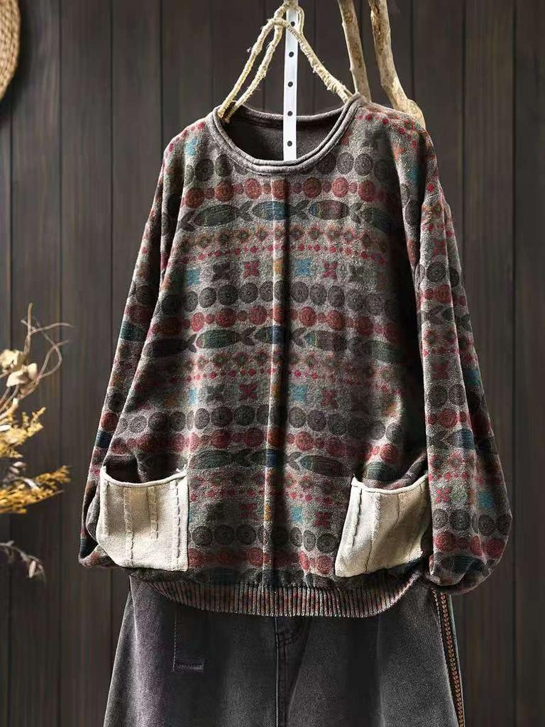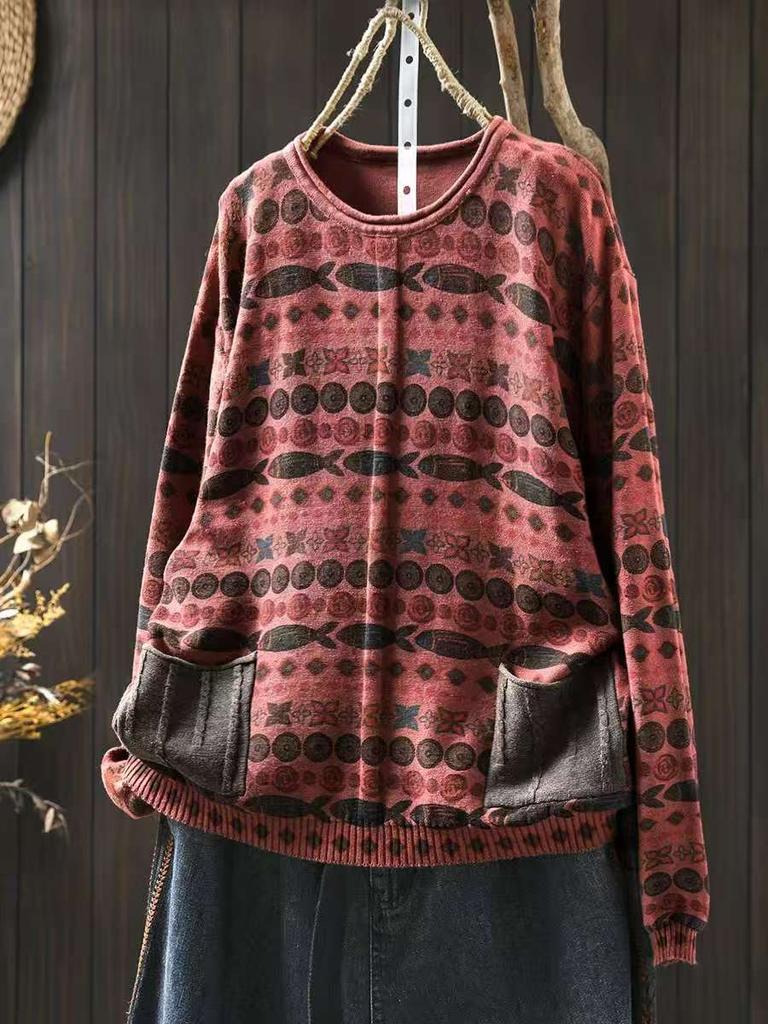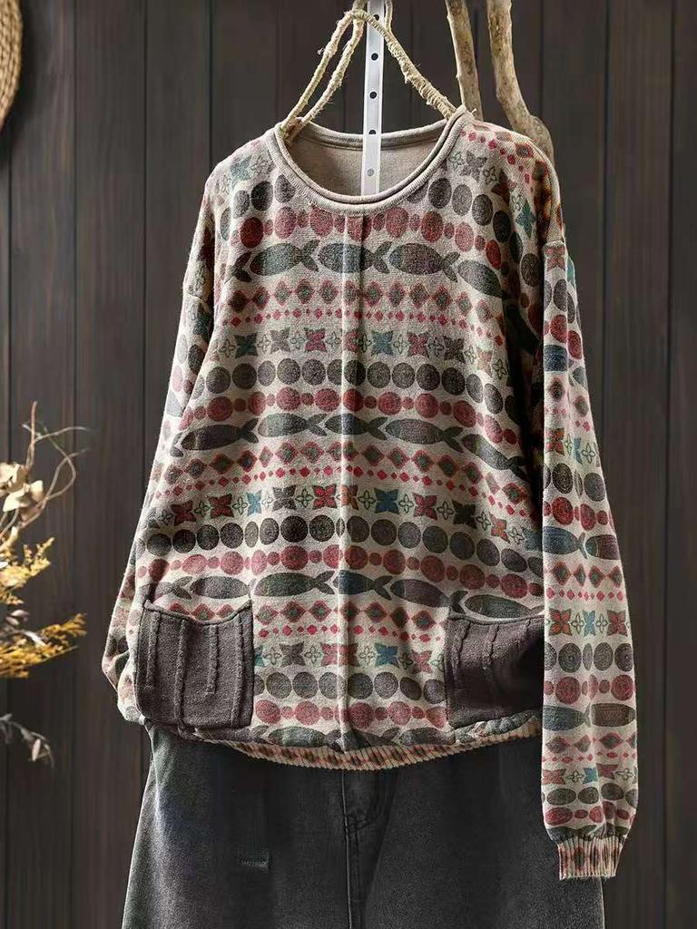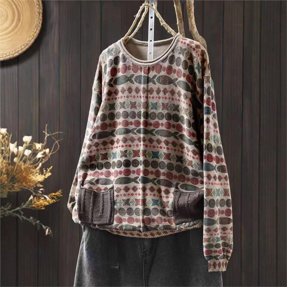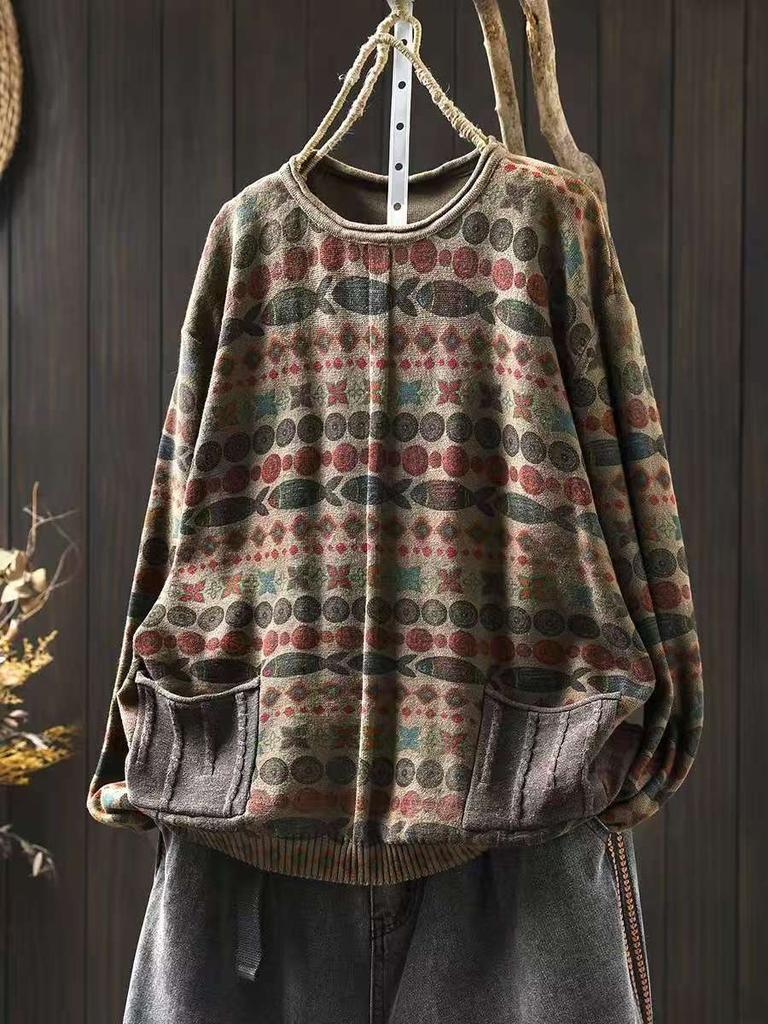 Johnature Женские винтажные пуловеры с принтом, вязаные, с круглым вырезом, с длинным рукавом, весенние, пэчворк, с карманами
