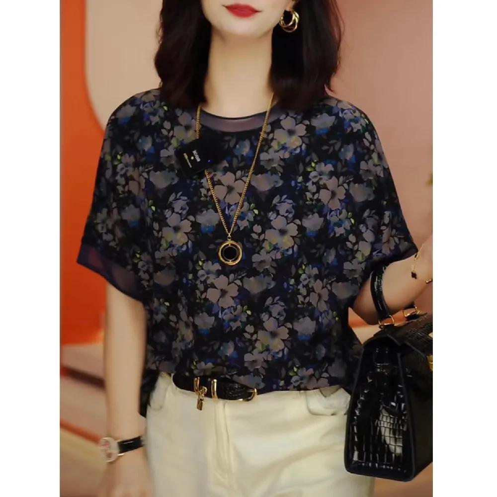 Женская летняя элегантная футболка с принтом, приталенный шифоновый топ с коротким рукавом