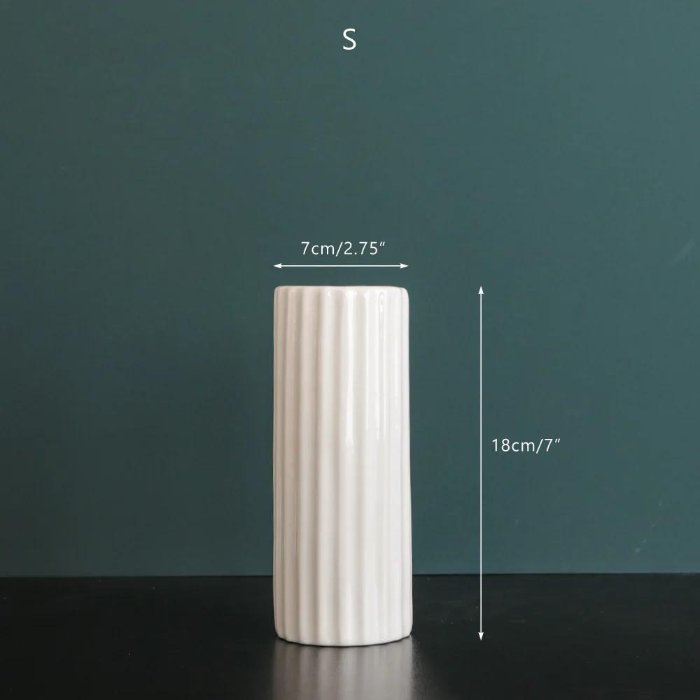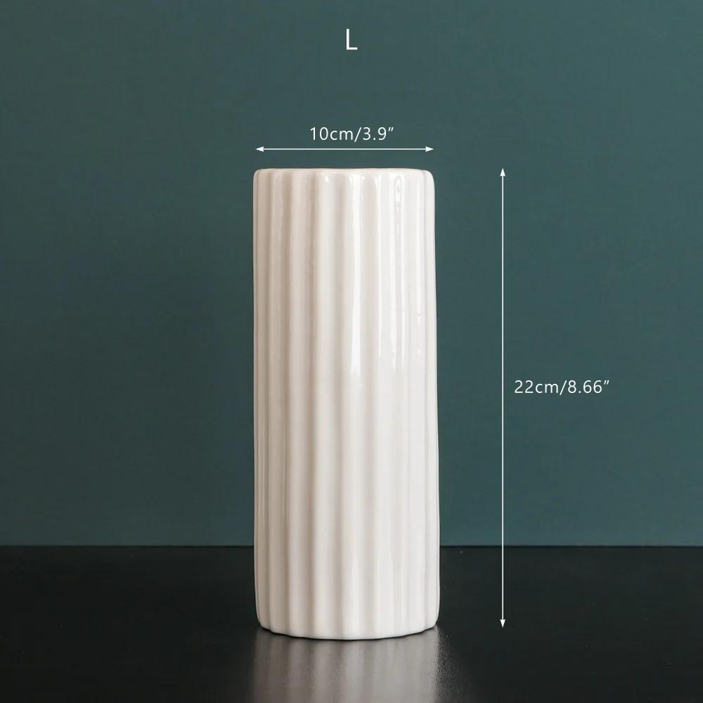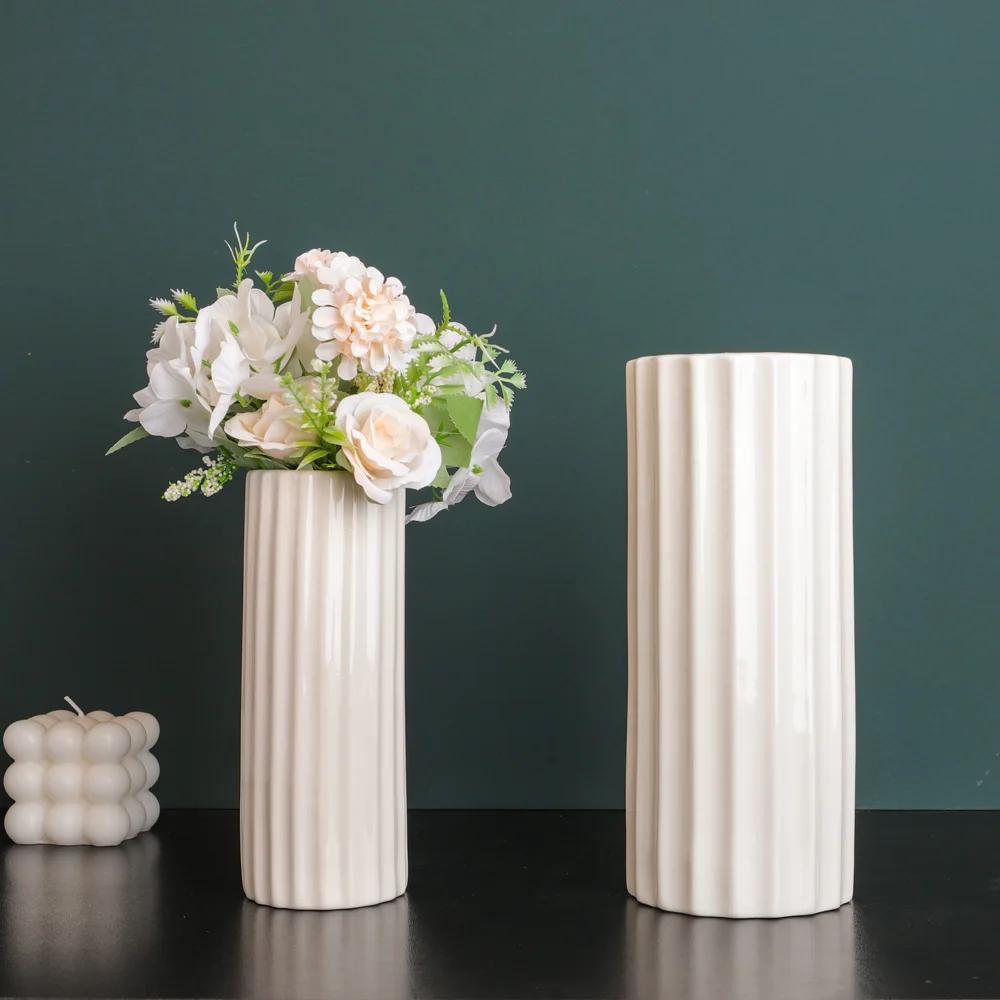 Домашняя декоративная керамическая ваза с вертикальными линиями, современные глазурованные белые вазы, стильная простая ваза для живых или искусственных цветов