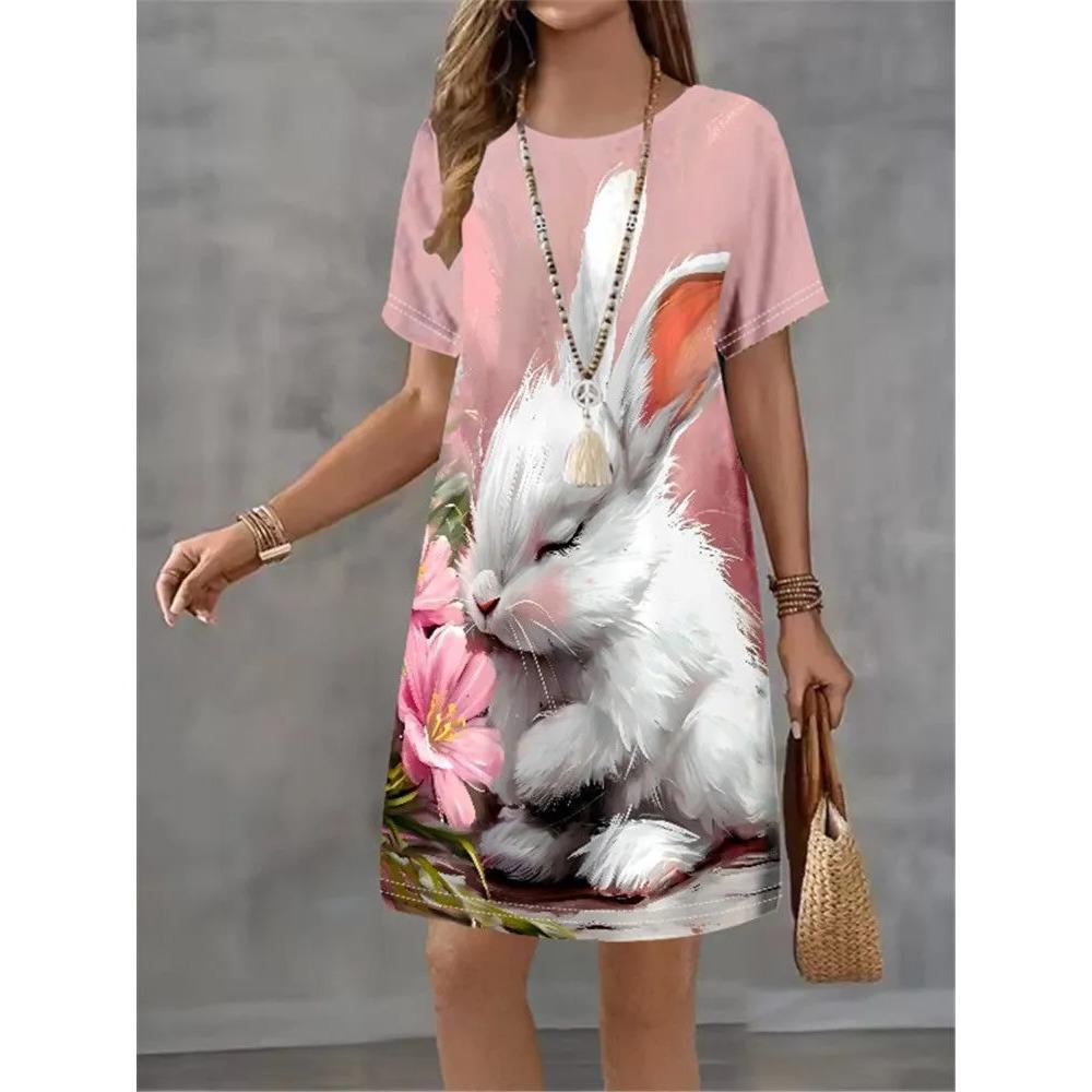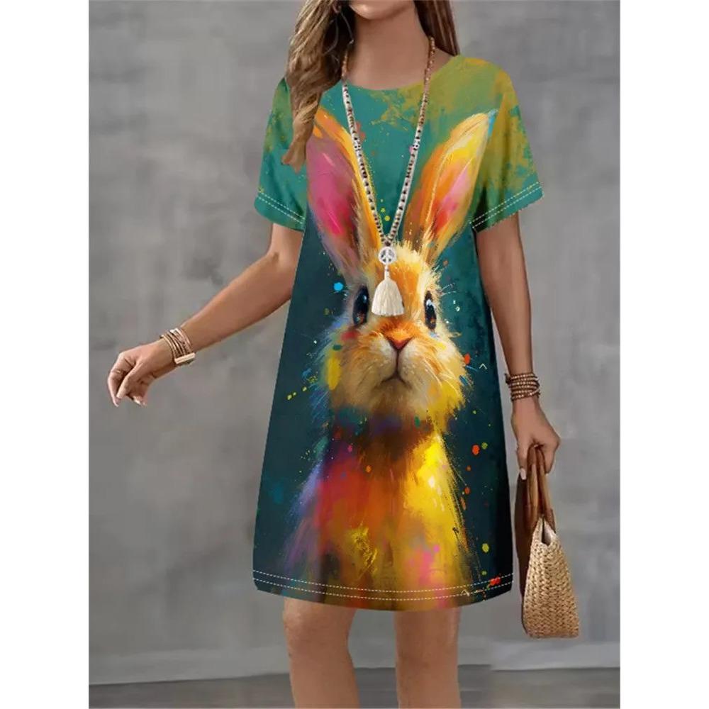 Summer Fashion Cute Rabbit Colorful Animal Printed Dress Ladies Loose Casual Oversized Comfortable Dress