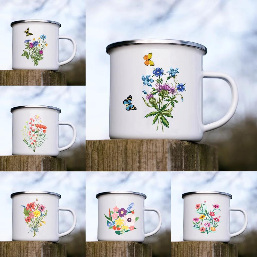 Креативные эмалевые кружки для кофе с цветочным принтом, походные чашки для сока, какао, студенческие кружки для завтрака и молока для детей