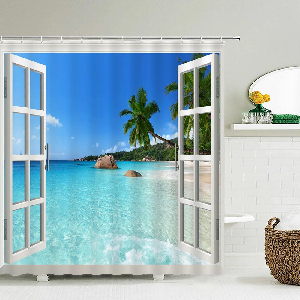 Занавеска для душа с крючками «Прибрежный пейзаж» Декор для ванных комнат в свежей морской тематике, усиленные петли и легко чистить