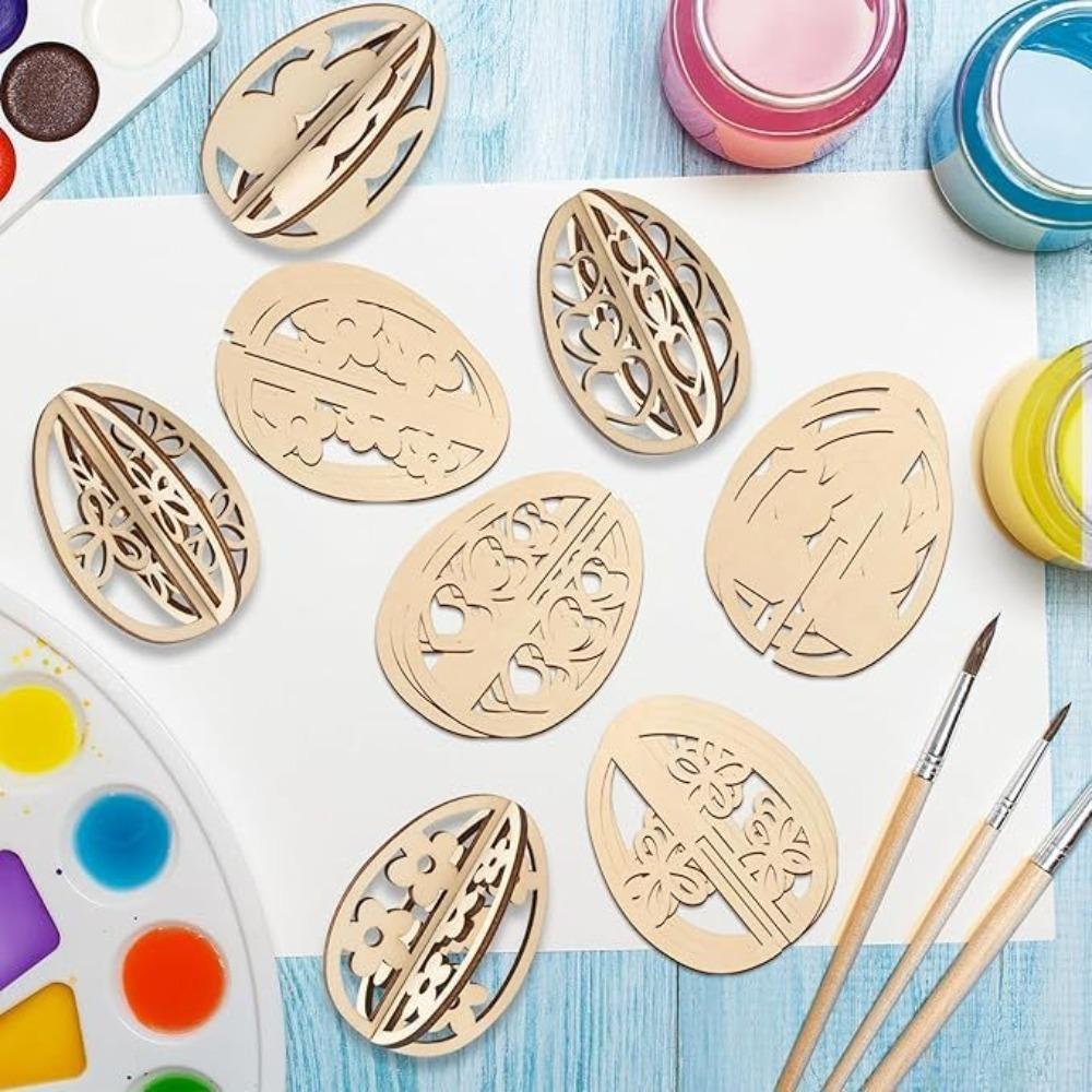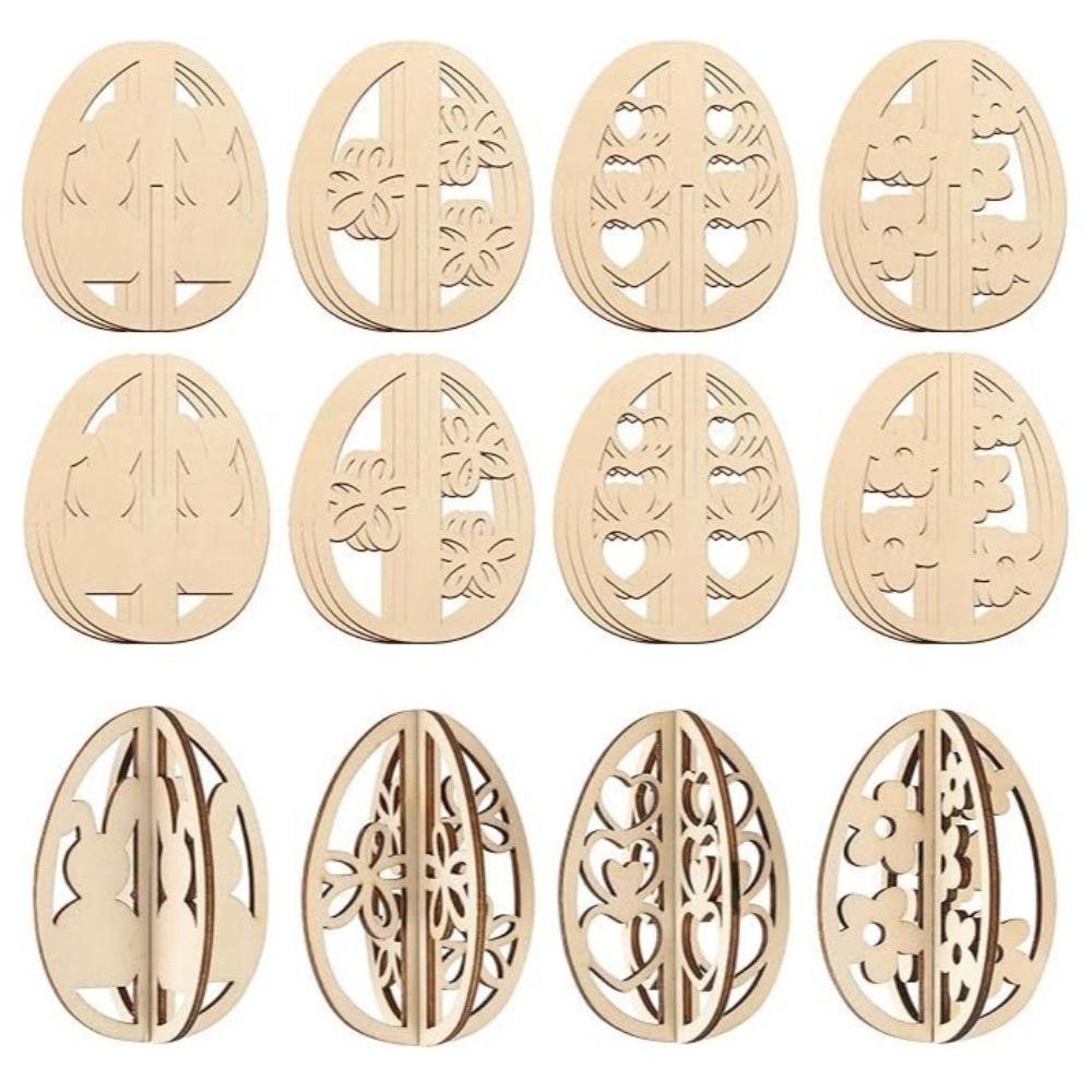 12pcs DIY Easter Eggs Wood Crafts Handmade 3D Stars Butterfly Unfinished Wooden Slices Paintable Desktop Ornaments Holiday Decor
