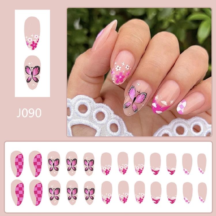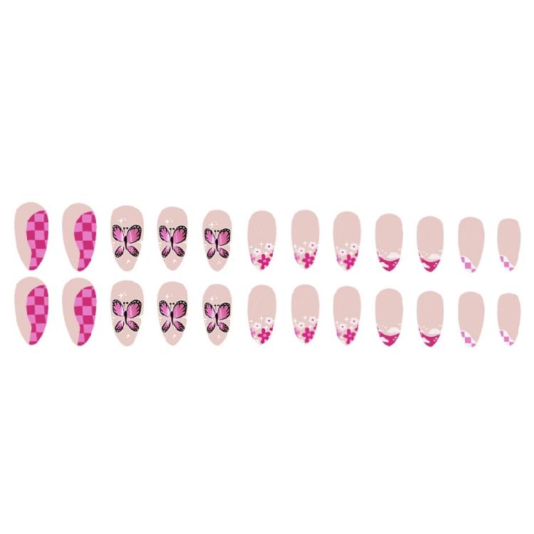 24 Pcs French Tip Stick On Nail Butterfly False Nail Short Almond Press On Nail Flowers Artificial Acrylic Nail