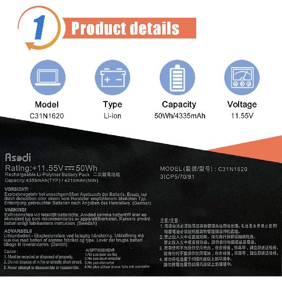 <1>Модель: Ц31Н1620 . напряжение: 11,55 В . Вместимость: 50 Втч/4335 мАч 4-элементный. цвет: черный . 100% Абсолютно новый. (Пожалуйста, откройте заднюю крышку вашего ноутбука и проверьте точный номер детали оригинальной батареи вашего ноутбука перед размещением заказа.)