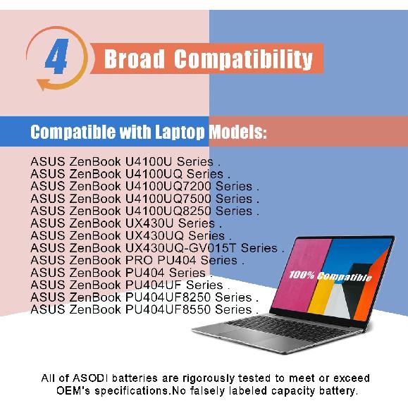 <2>Совместимые модели: для серии ASUS ZenBook U4100U / U4100UQ / U4100UQ7200 / U4100UQ7500 / U4100UQ8250, серии ASUS ZenBook UX430UQ / UX430UQ-GV015T, серии ASUS ZenBook PRO PU404, серии ASUS ZenBook PU404 / PU404UF / PU404UF8250 / PU404UF8550. (Важная заметка:Эта модель аккумулятора имеет два типа кабельных интерфейсов: слева и справа. пожалуйста, подтвердите форму вашей оригинальной батареи перед размещением заказа. В этом объявлении, которое мы продаем, кабельный интерфейс находится слева!)