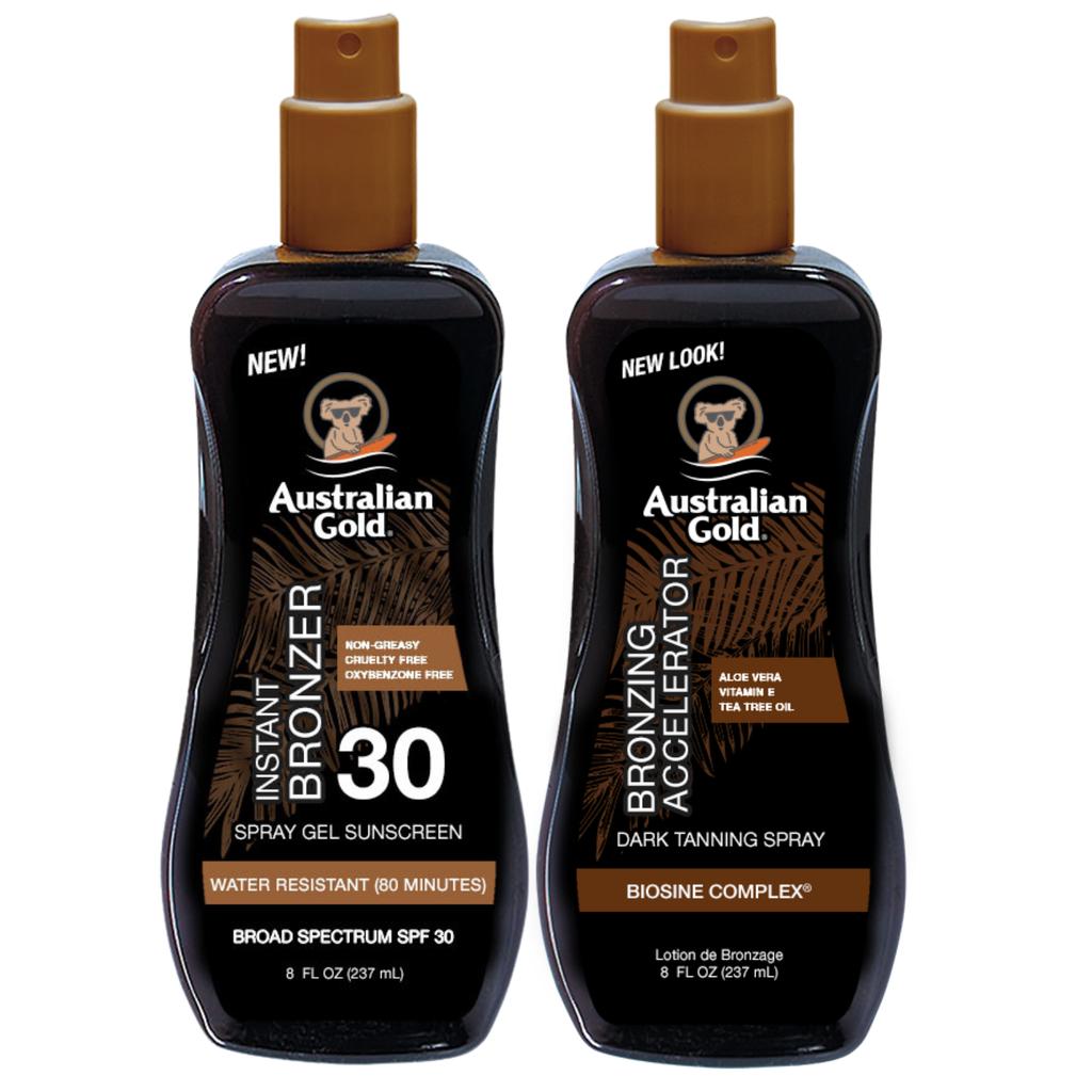 Australian Gold Spray Bronzer SPF30 + Tanning Gel Accelerator. Australian Gold Spray Gel with Bronzer SPF30. Australian Gold SPF 30 in a highly recognizable brown bottle is a spray gel containing natural tanning extracts. It provides excellent protection against UVA and UVB radiation and absorbs quickly. Thanks to natural caramel bronzers, it ensures a quick tan with an incredibly dark shade. The gel contains aloe vera, vitamin E, Australian tea tree oil, Kakadu plum (the richest source of vitamin C), and sunflower seed extracts to not only protect but also nourish the skin. Plus, it smells wonderful! The scent evokes a blissful vacation and sunny holidays! The spray bottle is 237 ml. Australian Gold Dark Tanning Accelerator Spray Gel with Bronzer is only for experienced tanners, as it contains no sun protection. It has fantastic bronzing properties. Thanks to a unique combination of high-quality bronzers and numerous skin-nourishing ingredients, your complexion will become darker than ever before. Black walnut extracts provide immediate results, while the wonderful DHA ensures the color remains incredibly long-lasting. And what a wonderful skincare experience! Aloe, provitamin B5, vitamins A and E, and a rich blend of natural plant extracts. 237 ml spray bottles.