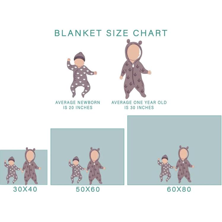 Размеры: Детская пеленка размером 30" x 40" достаточно большая, чтобы полностью укрыть младенца/новорожденного, подходит для использования в детских кроватках, колясках, люльках, автокреслах и кроватях в детском саду для малышей.. Защитное одеяло 40" x 50" подходит для малышей мальчиков и девочек, 50" x 60" идеально подходит для подростков и взрослых в качестве диванного пледа. 60" x 80" достаточно большой для кровати размера «queen-size»