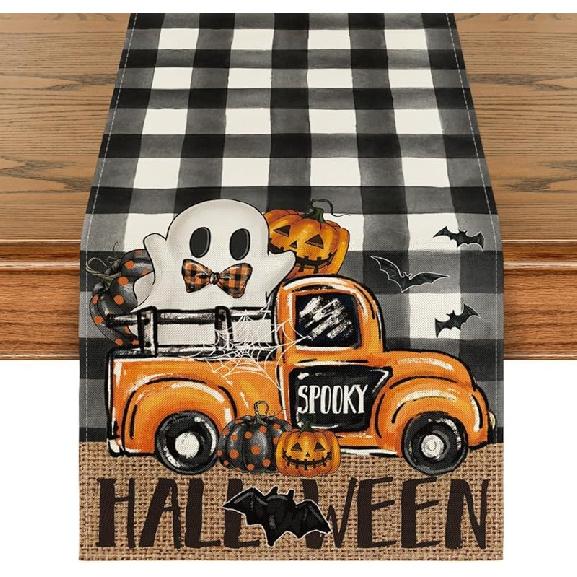 Halloween Gnome Yellow Car Black White and Check Table Runner Seasonal Kitchen Dining Table Decoration Flag Autumn Home Party Tablecloth Decor 13x72