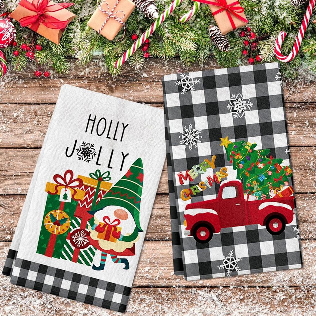 2 Pack Christmas Kitchen Towels and Dish Towels, 16 x 24 Inch Christmas Plaid Truck Tree Gnome Gift Box Absorbent Drying Cloth Tea for Cooking Baking