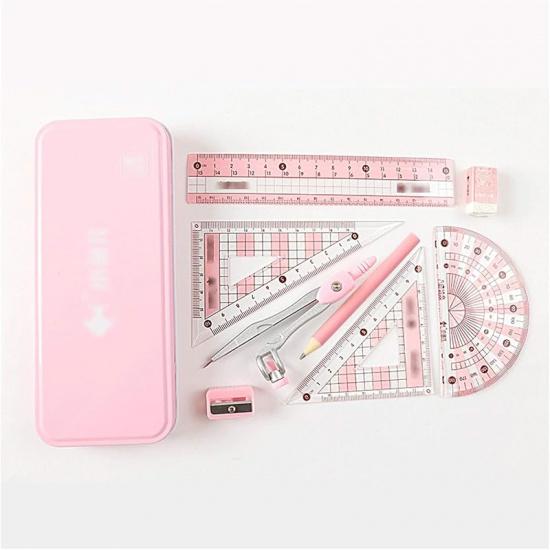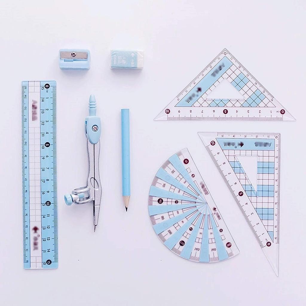 Compasses Student Geometry Set Math Compass Divider, Set Squares, Ruler, Compasses and Protractor, 8 Piece Set Measuring Tools(Pink)
