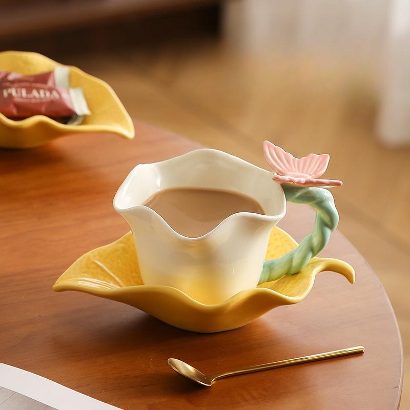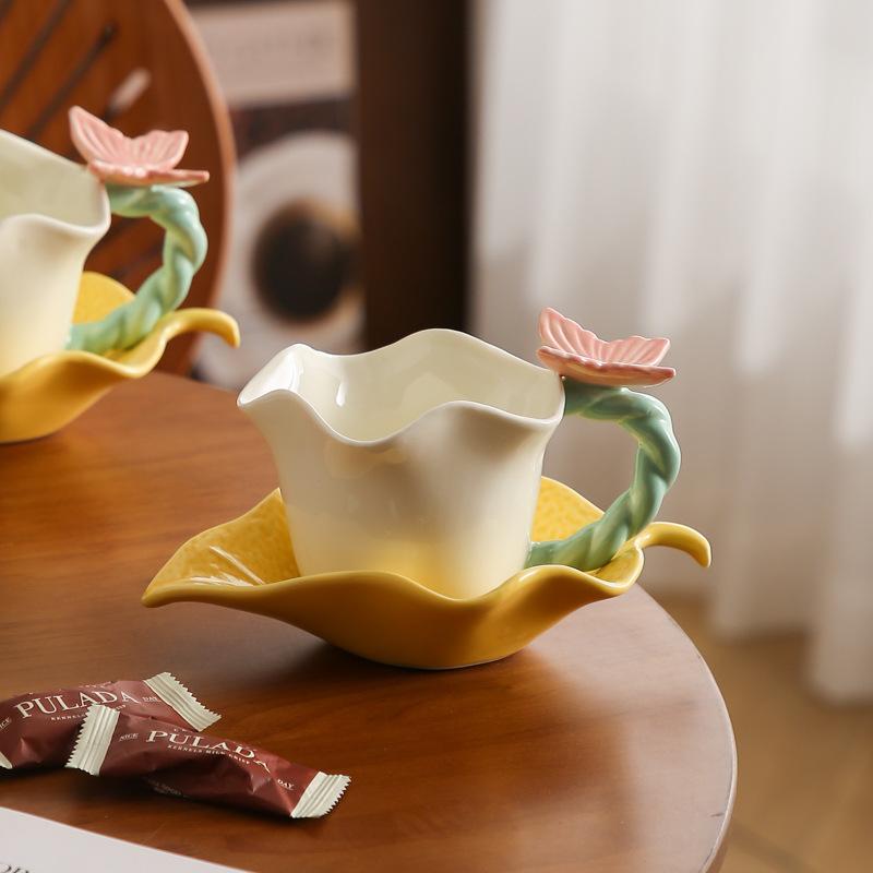Керамическая кружка с высоким эстетичным цветочным рельефом и блюдцем, милые кофейные чашки для пары, набор чашек для послеобеденного чая, бытовая посуда для напитков