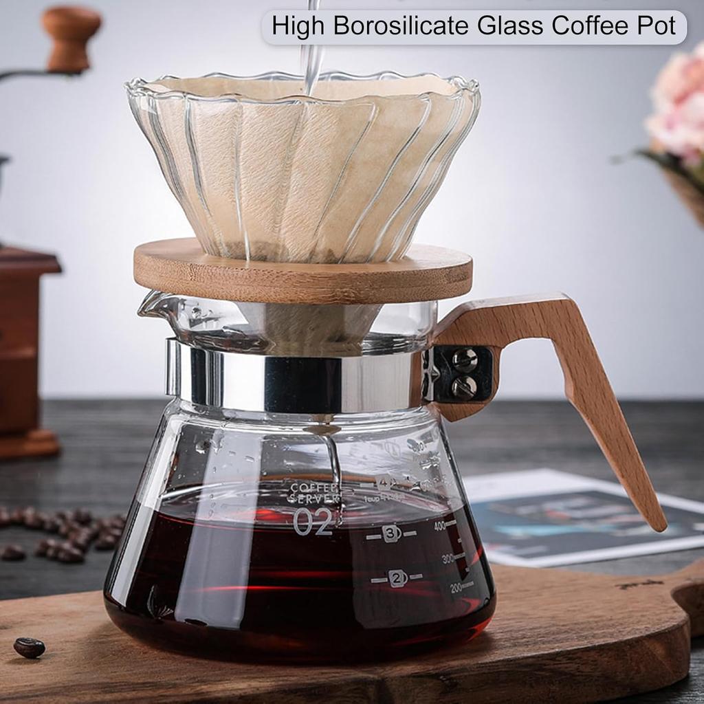 Glass Carafe Coffee, High Borosilicate Glass Coffee Pot V-Shaped Outlet Heatproof Mug Wooden Measuring Cups Coffee Carafe (600ml)