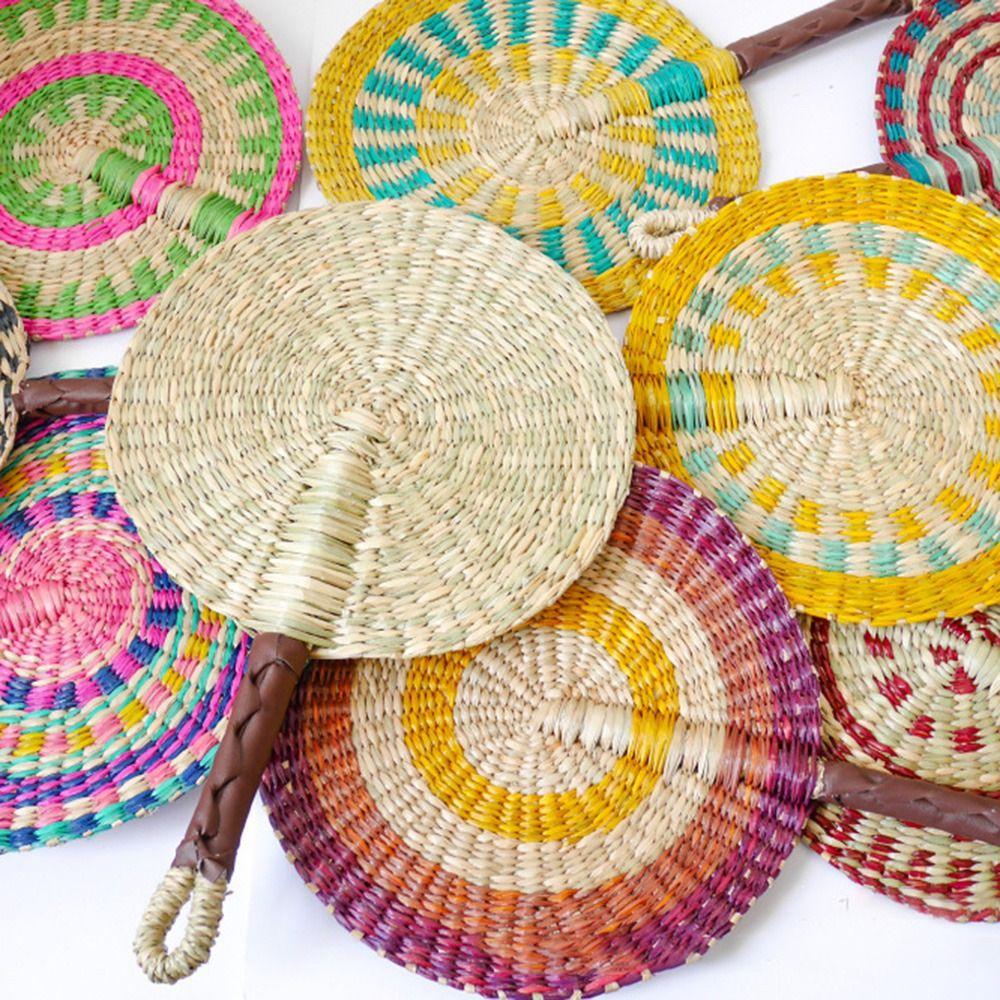Винтажный плетеный веер из морской травы, разноцветные полосатые узоры, летний веер для охлаждения, украшение для дома