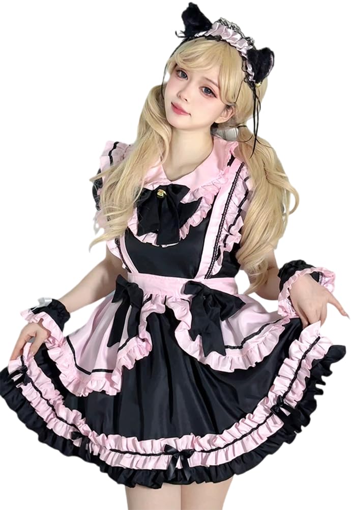 Maid Gothic Waitress Cosplay Costume with Frilled Lolita Neat and Perfect for Cafes and Amusement Short Black and Pink Ear Size [Shangki — купить товар онлайн с бесплатной доставкой по всему миру!