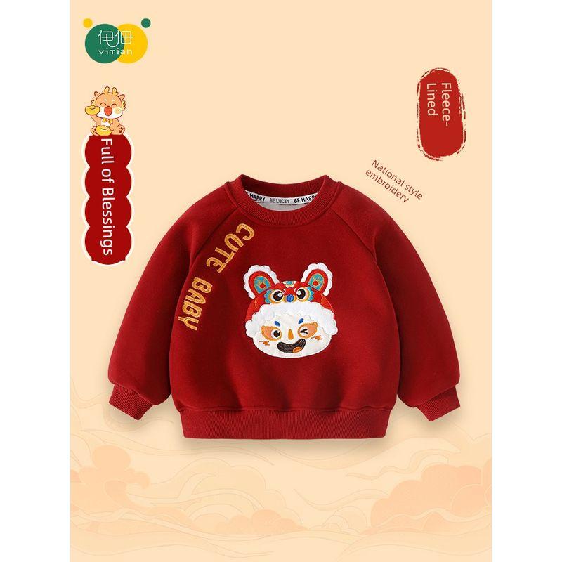 Baby Fleece-Lined Red Sweatshirt Winter Wear Thickened Festive New Year Boys' Top Children's New Year Greeting Clothes for Girls
