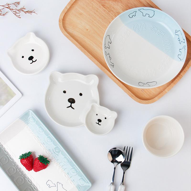 Бесплатная доставка Керамическая посуда в японском стиле с белым медведем, Подглазурная роспись, Милая детская тарелка для еды, Тарелка-подкладка, Поверхностная миска, Салатник