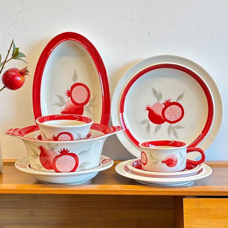 Керамическая посуда "Красный гранат" Высокотемпературная подглазурная роспись Бытовые миски Высококачественная чашка для завтрака Миска для риса Двуручная миска