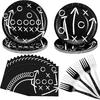 One Happy Dude Dinnerware Set: you will get 96 pieces of one happy dude party tableware set, including 48 pieces of smile face paper plates with 2 sizes (24 pieces of 9 inches and 24 pieces of 7 inches), 24 pieces of forks in yellow and black colors, and 24 pieces of smile face napkins, nice combinations are great for entertaining about 24 guests