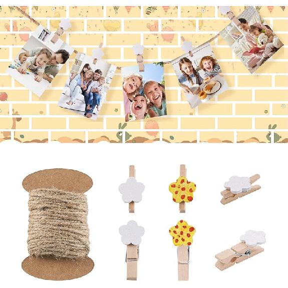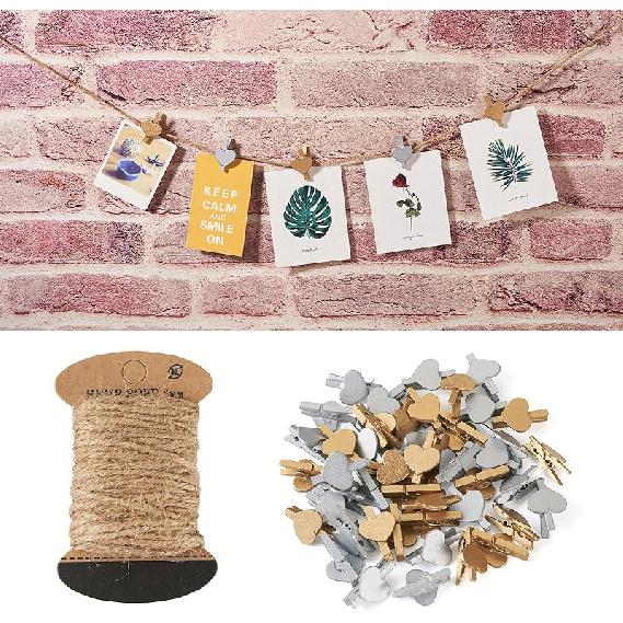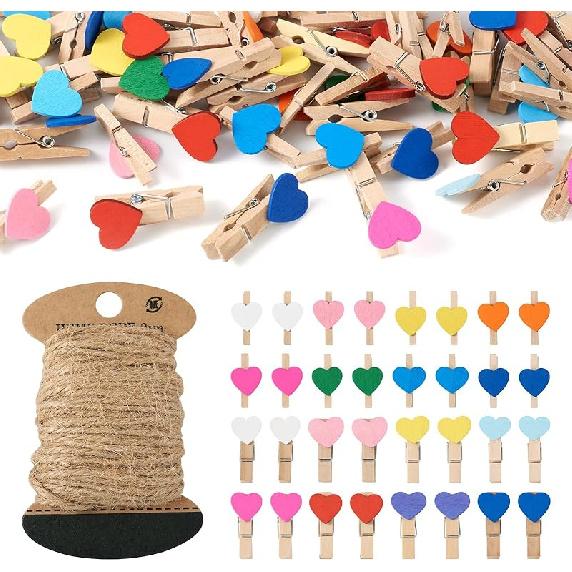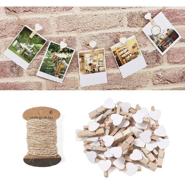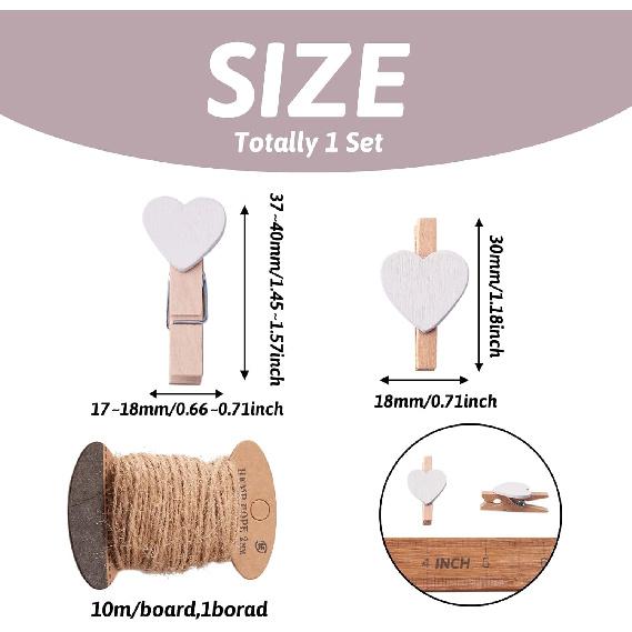 Pandahall 100pcs White Heart Clothespins Wooden Photo Paper Peg Pin Craft Clips with 10.9 Yards Natural Jute Twine for Paper Photo Display Hanging