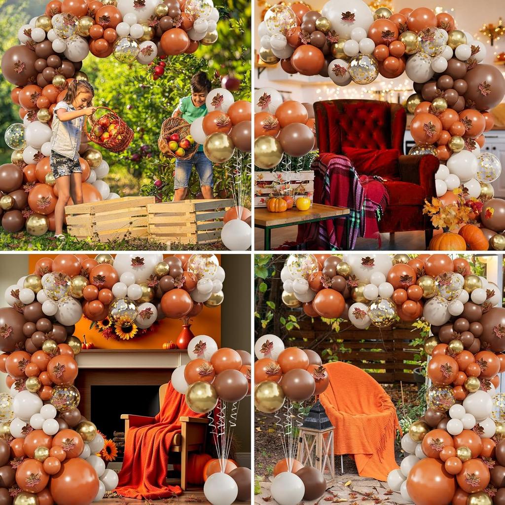 Набор для арки из 215 воздушных шаров на тему осени и Дня благодарения. В комплект входят: Набор для арки из воздушных шаров «Осень. День благодарения» включает 54 шт. шаров жженого оранжевого цвета(18 дюймовx1,12 дюймаx8,12 дюймаx25,5 дюймаx20), 54 шт. кофейно-коричневых шаров(18 дюймовx1, 12 дюймовx8, 10 дюймовx25, 5 дюймовx20), 12-дюймовые золотые шары с конфетти x5, 25 шт. песочно-белых шаров(10 дюймовx15, 5 дюймовx10), 20 шт. металлических золотых шаров(10 дюймовx10, 5 дюймовx10), 50 шт. кленовых листьев, лента для воздушных шаров, 16 футов лента-полоска для воздушных шаров, 100 шт. точечного клея