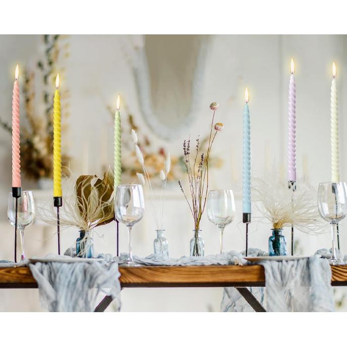 🍭 Потрясающие свечи конфетных цветов: Набор конусных свечей включает 6 подсвечников разных цветов (Синий, Желтый, Розовый, Зеленый, Фиолетовый, Слоновая кость) который горит примерно 6-8 часов. Наши высокие свечи имеют красивый цвет, который добавит яркий акцент любому пространству или мероприятию.