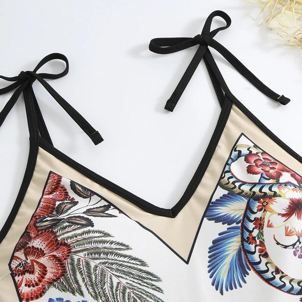 Цельный купальник с v-образным вырезом и завязками для женщин, модный купальник бикини с принтом, купальный костюм с высокой талией и пляжной юбкой с накидкой