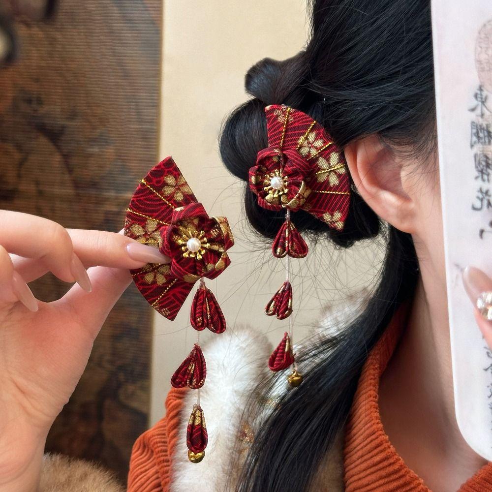 Колокольчик Кимоно Сакура Заколка для волос Цветок Ханьфу Веер Зажим для волос Милый Веер с кисточкой Зажим для волос На улице
