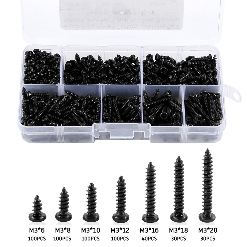 500 шт. Винты M3 Черные саморезы Полукруглая головка Крест Саморез по дереву Набор ассорти 6/8/10/12/16/18/20 мм Углеродистая сталь