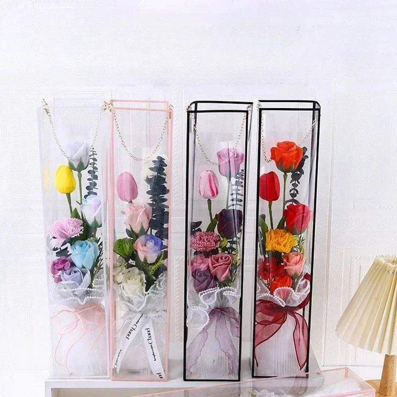 5 шт. Прозрачный пластиковый пакет для упаковки цветов Белые пакеты с ручкой из металлической цепочки Подарочная коробка Цветочная сумка Свадебное украшение