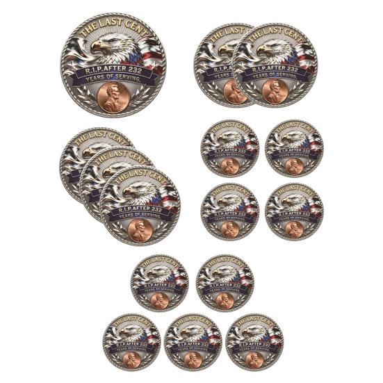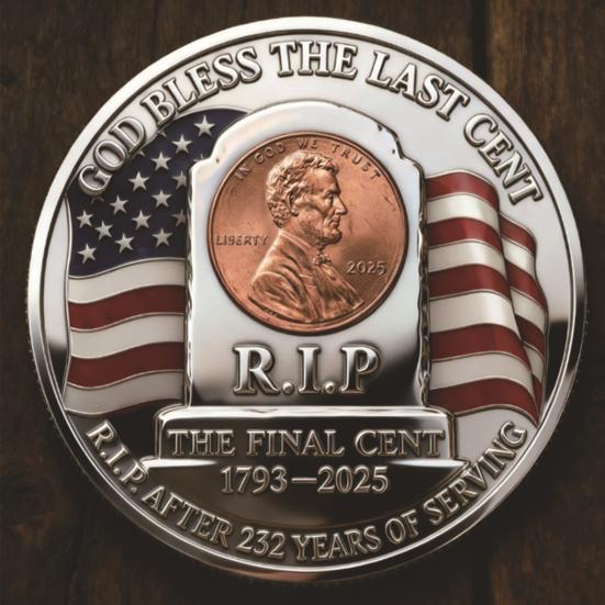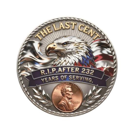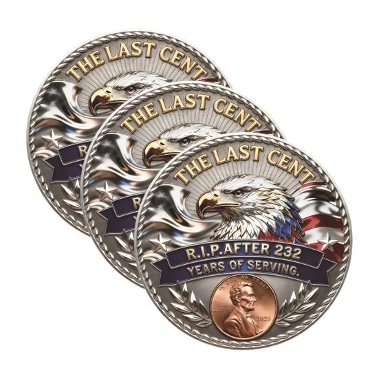 Центральное место в теме «Покойся с миром». ПОСЛЕДНИЙ ЦЕНТ 1793-2025," эта монета отмечает официальный вывод из обращения монеты в один цент после 232 лет службы. Окружающие центральную монету развевающиеся американские флаги с яркими звездами и красно-белыми полосами символизируют национальную гордость и наследие..