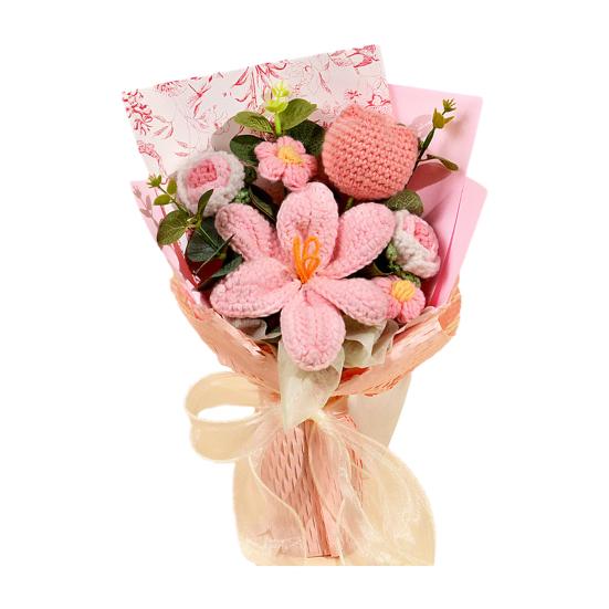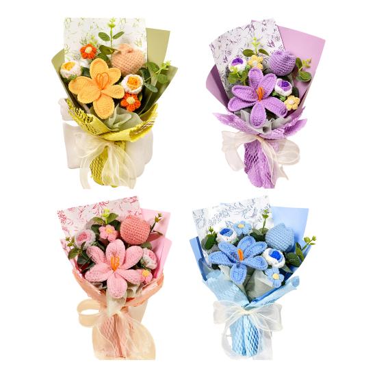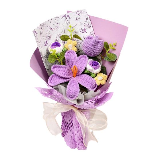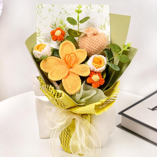 Ручная работа крючком: Каждый цветок тщательно сплетен вручную из мягкой пряжи, демонстрируя сложную текстуру и трехмерные детали.. Этот ремесленный подход придает букету теплоту и уникальность, отражая исключительное мастерство и сердечную креативность в каждой детали.