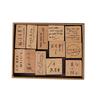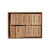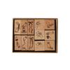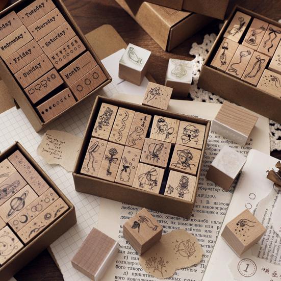 This stamp kit features high-quality natural wood blocks, offering a warm, comfortable touch and durable, eco-friendly construction. The clear, natural wood texture enhances user experience and gives each stamp a unique artistic feel. The set is neatly organized in multiple brown paper boxes by theme, ensuring easy access and tidy storage.
