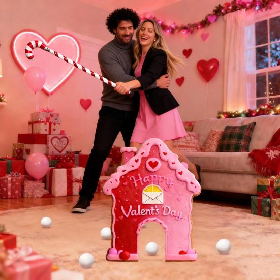 Этот набор для мини-гольфа на День святого Валентина предлагает полный, готовый к игре опыт с клюшкой для мини-гольфа, белыми мячами для гольфа, зелеными ковриками из искусственной травы и праздничными клюшками в виде леденцов.. Спроектированный как очаровательный пряничный домик, украшенный узорами в виде сердечек, розами и надписью «С Днем святого Валентина», он создает теплую, романтическую атмосферу, идеально подходящую для праздничного украшения или фотореквизита..