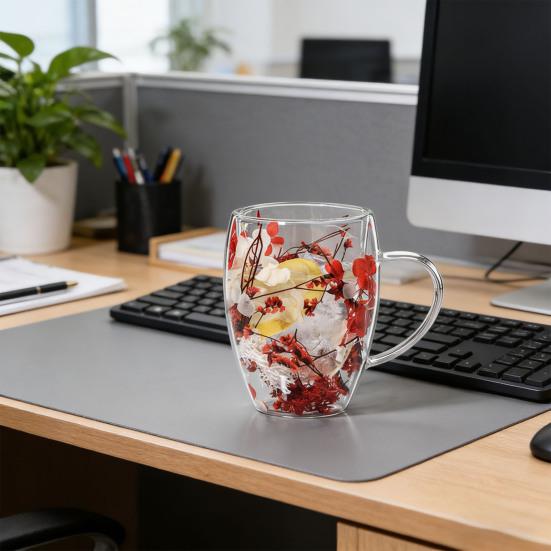 Уникальная эстетика с сухоцветами: Эта кружка с очаровательным дизайном, в котором сушеные цветы нежно покачиваются внутри стекла, дарит визуально захватывающее впечатление.. Нежная цветочная композиция добавляет шарма и элегантности, что делает ее продуманным выбором для подарка на дни рождения, праздники или особые торжества.