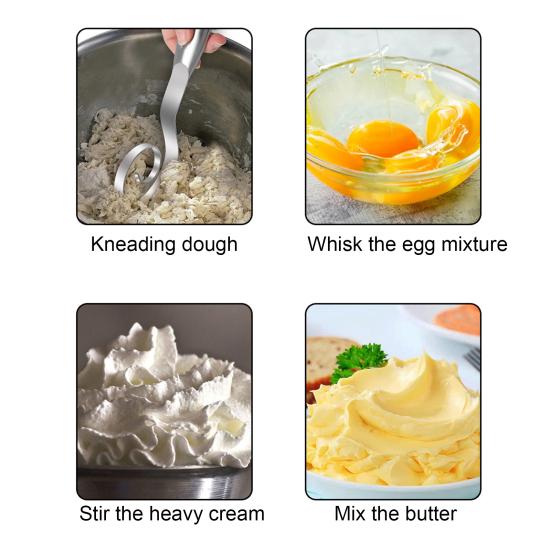 Универсальная кухонная необходимая вещь: Идеально подходящий для широкого спектра кулинарных применений, этот венчик превосходно справляется с замешиванием хлебного теста, теста для пирогов, кондитерских изделий, теста для пиццы и даже смесей для мясного рулета.. Он без труда справляется с липким тестом на закваске, что делает его незаменимым для ремесленной выпечки, а также для повседневных кулинарных задач.. Его адаптивность оптимизирует рабочий процесс на вашей кухне, заменяя несколько инструментов одним надежным приспособлением.